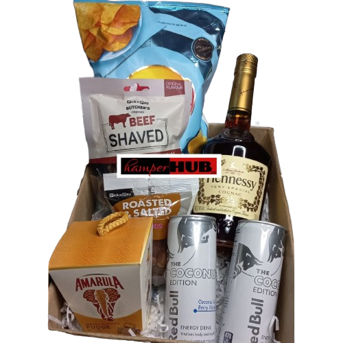Lays chips Hennessy V.S Amarula chocolates 2x Red Bull energy drinks Roasted nuts 100g beef biltong